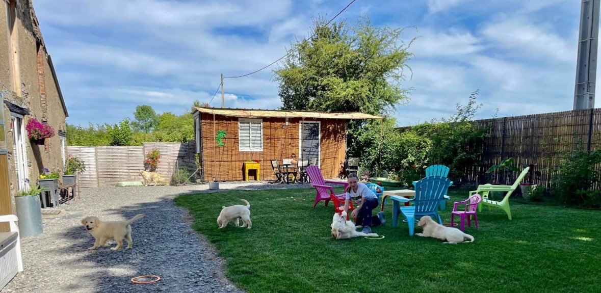- Socialisation aux bruits divers (voitures, musiques, visites d'élevage de nos clients, jeux, jouets et câlins à volonté...).