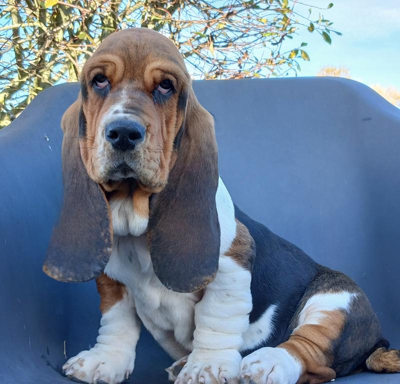 Le Basset Hound est un chien de taille moyenne, mais avec un corps allongé et des jambes courtes. Il est facilement reconnaissable par sa peau lâche et ses rides profondes, surtout autour de sa tête. Son museau est long et ses narines larges, lui donnant un sens aigu de l'odorat. La caractéristique la plus distinctive du Basset Hound est ses oreilles longues et tombantes qui atteignent souvent le sol. Sa queue est également longue, portée haut avec une légère courbe vers le haut. Son pelage est court et lisse, généralement tricolore ou bicolore.